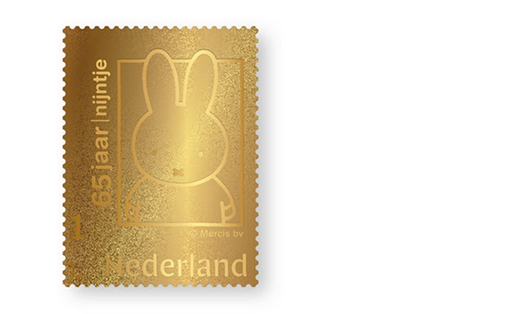 The gold stamp to celebrate Miffy’s 65th birthday can be ordered while stocks last only in the webshop and from the Collect Club customer service on +31 (0)88 868 99 00. The stamp is marked with ‘Nederland 1’, the denomination for items weighing up to 20g destined for delivery in the Netherlands. The validity period is indefinite.