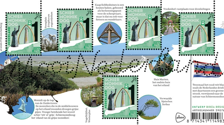 The Hague – The well-known 'Mooi Nederland' ('Beautiful Netherlands') stamp series will be dedicated to the Dutch Frisian Islands in 2019. Today, the fifth stamp sheetlet from this series was published, paying ample attention to Schiermonnikoog's nature and architecture. Stamps depicting Texel, Vlieland, Terschelling and Ameland were published earlier this year. At the same time as the stamps about Schiermonnikoog, PostNL today published an assembled stamp sheetlet depicting all five islands.