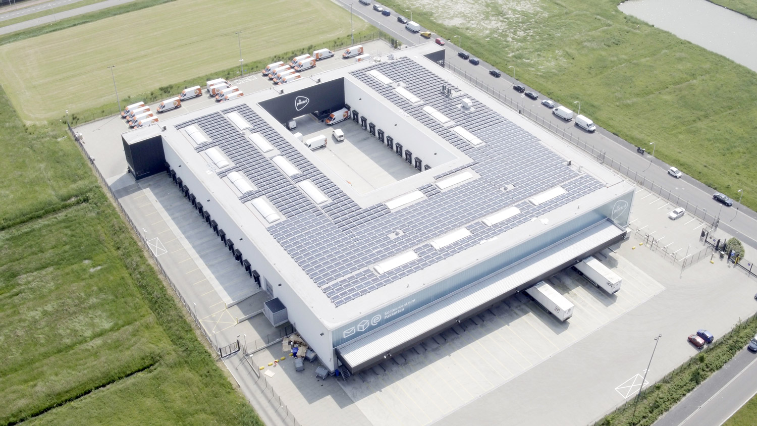 De buitenkant van een pakkettensorteercentrum, inclusief zonnenpanelen