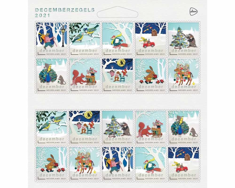 Voor de decemberzegels heeft Aalders een fantasievolle winterwereld bedacht. In tien scènes genieten verschillende dieren van de feestelijke decembermaand. De verschillende decemberzegels vormen een geheel doordat de dieren allemaal bezig zijn met het thema kerst, winter of december; een mol met zuurstok en rugzak, twee verliefde pimpelmezen onder een maretak, een vos met wapperende sjaal en envelop, een muis in een rood postautootje, een das die de kerstboom versiert met zijn sjaal, twee muizen die een pauw versieren, een eekhoorn die een slee met geschenken en lekkernijen voortduwt, een eekhoorn, haas, hond en uil bij de schaatsvijver, een haas met een bos kerstrozen en een als kerstboom opgetuigd damhert.