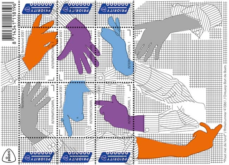 Den Haag, 13 september 2021 - Het nieuwste postzegelvel uit de serie Dutch Design is ontworpen door grafisch ontwerper Bart de Baets uit Amsterdam. In zijn ontwerp combineert De Baets opvallende gekleurde tekeningen van handen met streepjes- en ruitjespatronen uit de modewereld.