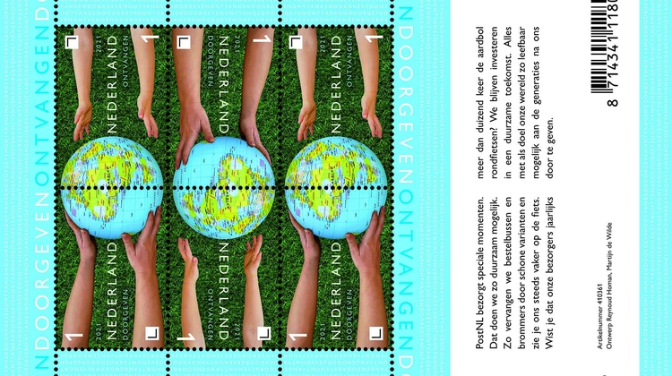 Den Haag, 22 maart 2021. Het nieuwste postzegelvel van PostNL is gebaseerd op het principe dat de mens de aarde van generatie op generatie zo goed mogelijk moet doorgeven. In het ontwerp van de duurzaamheidspostzegels is deze gedachte gevisualiseerd door een wereldbol te overhandigen: van ouder naar kind, van de ene postzegel naar de andere.