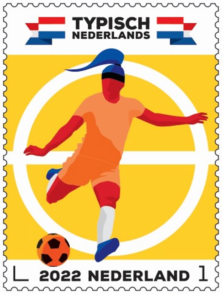 Op de vandaag uitgegeven postzegels van het postzegelvel Typisch Nederlands - voetbal staat een illustratie van een voetballer in actie. Zij houdt de ogen op de bal gericht en beweegt haar rechterbeen naar achteren als voorbereiding op haar schot. Edwin van Praet: “We hebben een warme, zomerse kleurencombinatie gekozen waarin geel, oranje en rood overheersen.