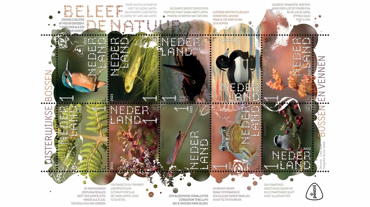 De meeste dieren en planten op het postzegelvel zijn in of bij het water te vinden, in de vennen, maar ook aan de oevers van de beekjes in het natuurgebied. “Daar kun je bijvoorbeeld de ijsvogel spotten, want die heeft een voorkeur voor stromend water”, vertelt Janse. “Natuurlijk zijn de bossen niet vergeten. Zo staat op het postzegelvel de zwarte specht die in bomen een nest uithakt. En de koningsvaren die eronder groeit.”