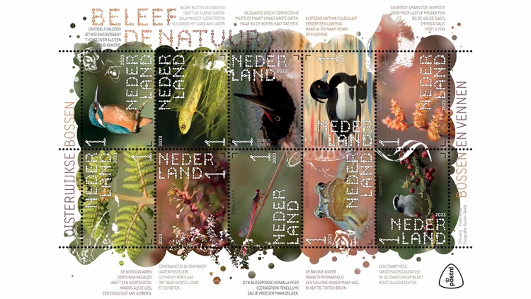 Den Haag, 14 augustus 2023. De Oisterwijkse Bossen en Vennen zijn geliefd bij natuurliefhebbers dankzij de bosrijke omgeving met sfeervolle vennen, verscholen heidevelden en de beekdalen van de Rosep, de Reusel en de Achterste stroom. In de serie ‘Beleef de natuur’ geeft PostNL vandaag een nieuw postzegelvel uit waarop de flora en fauna van dit afwisselende gebied centraal staan.