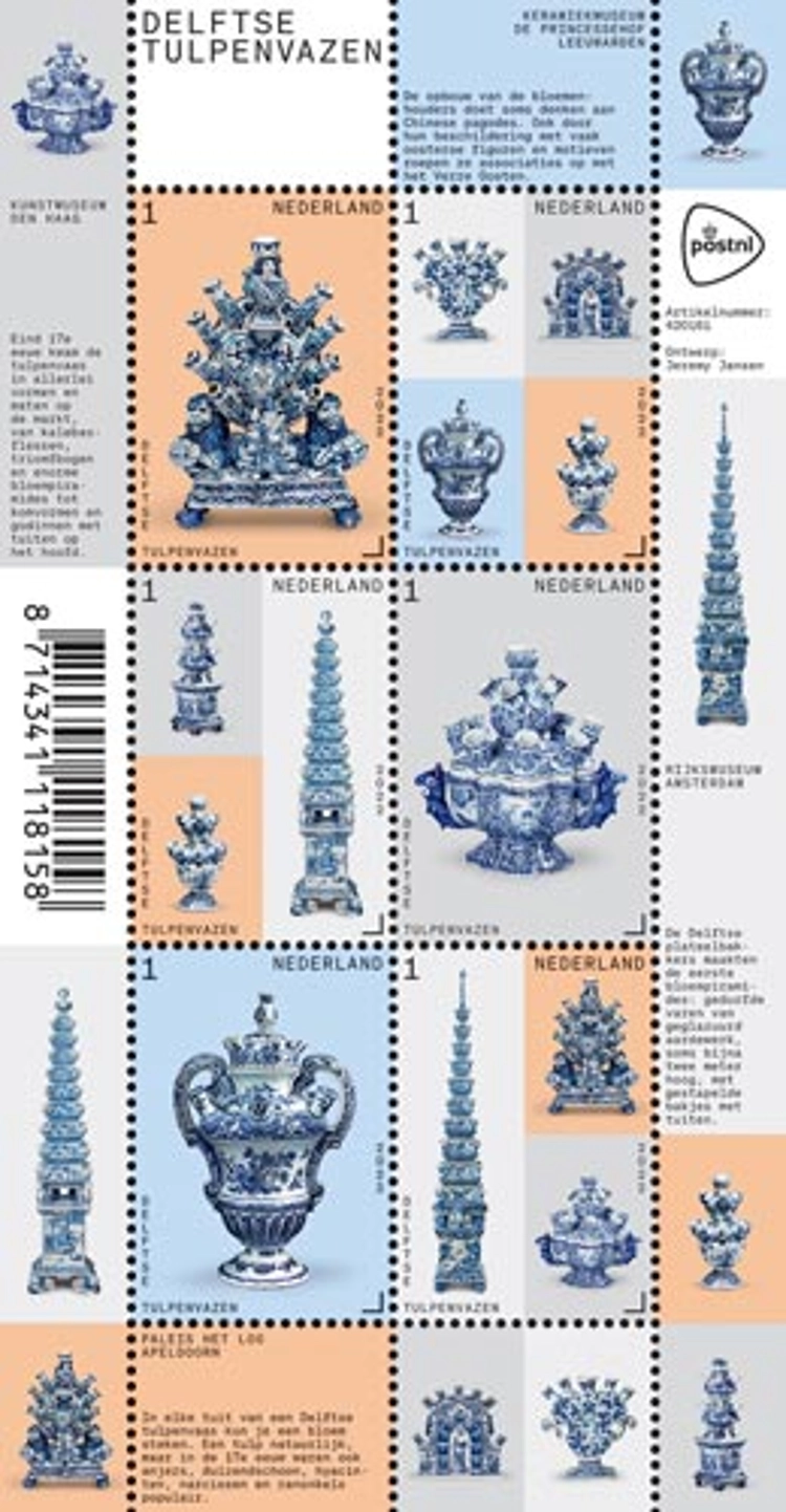 Het postzegelvel Delftse tulpenvazen telt zes verschillende postzegels met de waardeaanduiding Nederland 1, bedoeld voor post tot en met 20 gram met een bestemming binnen Nederland. De postzegels zijn vanaf 21 maart 2022 verkrijgbaar bij de Bruna-winkels en via