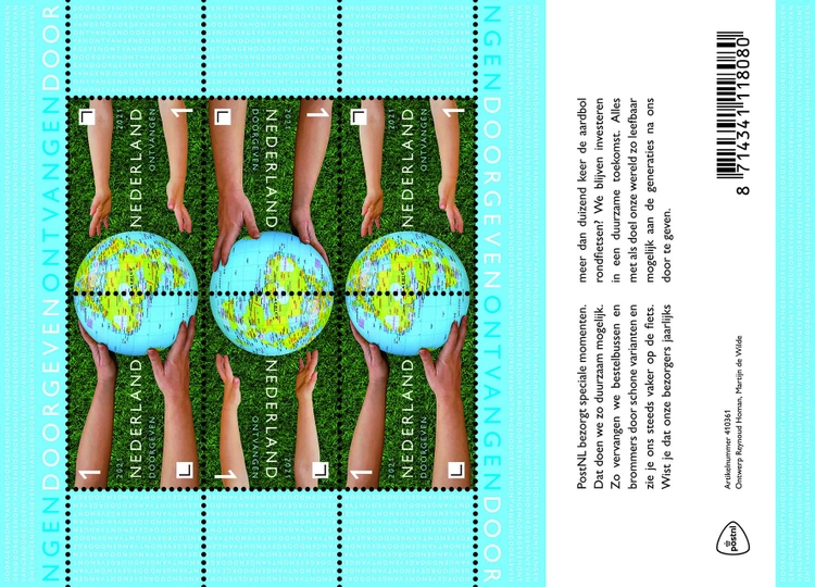 Den Haag, 22 maart 2021. Het nieuwste postzegelvel van PostNL is gebaseerd op het principe dat de mens de aarde van generatie op generatie zo goed mogelijk moet doorgeven. In het ontwerp van de duurzaamheidspostzegels is deze gedachte gevisualiseerd door een wereldbol te overhandigen: van ouder naar kind, van de ene postzegel naar de andere.