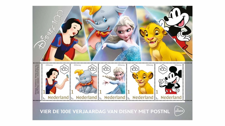 Op het vel met de 5 postzegels zijn 5 iconische Disneykarakters afgebeeld: Sneeuwwitje, Dombo, prinses Elsa uit Frozen, Simba uit The Lion King en Mickey Mouse. Op de bovenste velrand bevindt zich een collage van dezelfde afbeeldingen in een uit driehoeken opgebouwd patroon, dat de facetten van een diamant verbeeldt. Tegelijk met het postzegelvel ‘Disney 100 jaar’ brengt PostNL een Mickey Mouse-postzegel met 24-karaats goud uit, inclusief een speciaal bewaardoosje met certificaat van echtheid.