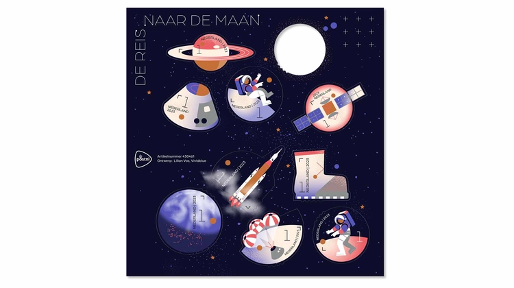 Het ontwerp van het postzegelvel “De reis naar de maan” is gemaakt door grafisch ontwerper Lilian Vos, van het bureau Vividblue uit Amsterdam. Op de postzegels staan illustraties met een directe relatie tot de ruimte. “De postzegels zijn een verbeelding van de werkelijkheid, dat maakt ze zo iconisch”, zegt Vos. “Ik heb goed gekeken naar hoe de ruimtevaart er tegenwoordig uitziet. Met de draagraketten en ruimtecapsules van nu. Ook zijn de ruimtepakken afgebeeld die de astronauten straks zullen dragen tijdens ruimtewandelingen en op de maan.”