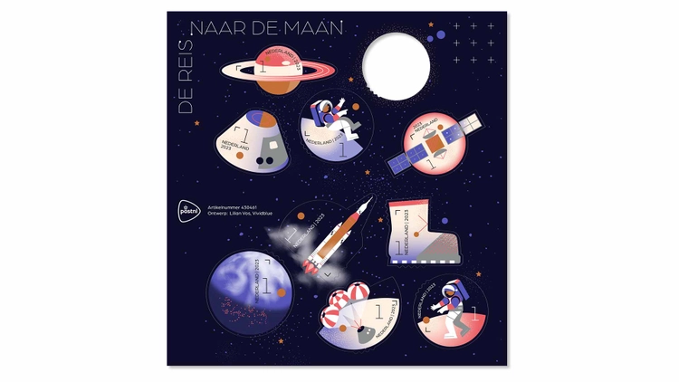 Het ontwerp van het postzegelvel “De reis naar de maan” is gemaakt door grafisch ontwerper Lilian Vos, van het bureau Vividblue uit Amsterdam. Op de postzegels staan illustraties met een directe relatie tot de ruimte. “De postzegels zijn een verbeelding van de werkelijkheid, dat maakt ze zo iconisch”, zegt Vos. “Ik heb goed gekeken naar hoe de ruimtevaart er tegenwoordig uitziet. Met de draagraketten en ruimtecapsules van nu. Ook zijn de ruimtepakken afgebeeld die de astronauten straks zullen dragen tijdens ruimtewandelingen en op de maan.”