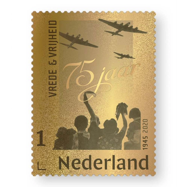 Op de vandaag verschenen gouden postzegel staat een foto van zwaaiende Nederlanders die overtrekkende geallieerde vliegtuigen groeten. Over de foto heen is in een cursieve letter 75 jaar geschreven. De foto, gemaakt door J. van Rhijn, komt uit het Nationaal Archief/Spaarnestad Photo in Den Haag.