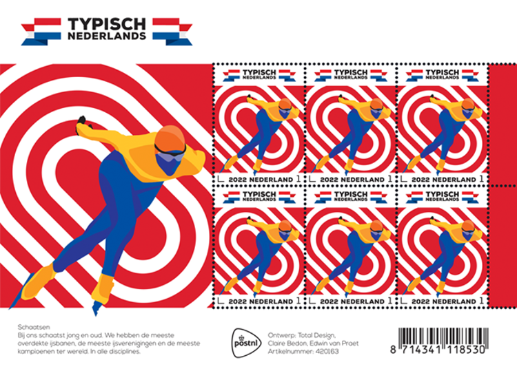 Den Haag, 3 januari 2022 - PostNL besteedt in 2022 met de serie Typisch Nederlands aandacht aan verschillende sporten waarin Nederlanders uitblinken. Vandaag verschijnt het eerste postzegelvel over de schaatssport.