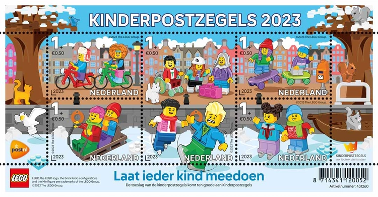 Den Haag, 13 oktober 2023 - Op de nieuwe kinderpostzegels verbeelden minifiguren van de LEGO Groep het thema ‘laat ieder kind meedoen’ van de kinderpostzegelactie van 2023. Vanaf vandaag bezorgt PostNL de kinderpostzegels, die ook dit jaar weer door ruim 130.000 schoolkinderen aan de deur zijn verkocht.