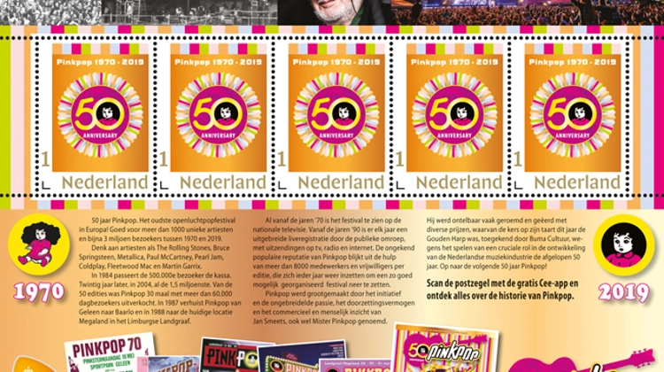 Den Haag, 19 april 2019 – Over precies 50 dagen begint de 50e editie van Pinkpop. PostNL eert dit oudste openluchtpopfestival van Europa met de uitgifte van het postzegelvel 50 jaar Pinkpop. De 5 speciale jubileumpostzegels zijn straks ook op het festivalterrein te koop.