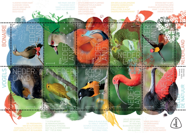 Op Bonaire komen ruim 200 verschillende vogelsoorten voor, zowel broedvogels en wintergasten als regelmatige bezoekers en dwaalgasten. Op het postzegelvel ‘Beleef de natuur - vogels Bonaire’ zijn de volgende 10 vogels afgebeeld: kuifcaracara, roodpootgent, mangrovezanger, Chileense kievit, oranje troepiaal, Caribische rode flamingo, rode ibis, geelvleugelamazone, Amerikaanse fregatvogel en muskietkolibrie.