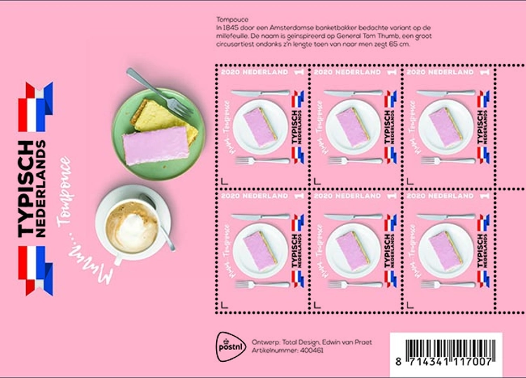 Den Haag, 6 april 2020 – PostNL brengt vandaag nieuwe postzegels uit in de serie Typisch Nederlands. Deze keer staat de tompouce centraal, het bekende roze gebak dat op Koningsdag meestal oranje is. De serie Typisch Nederlands besteedt dit jaar aandacht aan etenswaren en gerechten die kenmerkend voor ons land zijn.