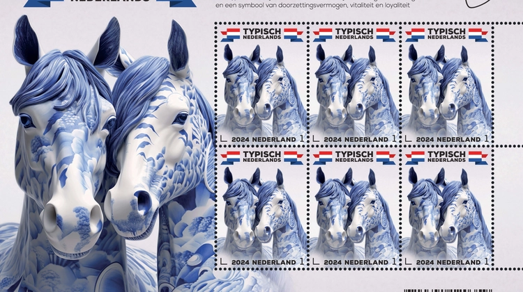De vandaag uitgegeven postzegels ‘Typisch Nederlands - paarden’ zijn ontworpen door het bureau Total Design uit Amsterdam. Op de zegels zijn 2 paarden vol kracht, gratie en liefde geportretteerd. Ze staan dicht tegen elkaar aan, terwijl hun hoofden elkaar raken. De ontwerpers van het bureau gaven een moderne twist aan de postzegels door met behulp van het AI-programma Midjourney portretten te ontwerpen als beeldjes van glanzend Delfts blauw.