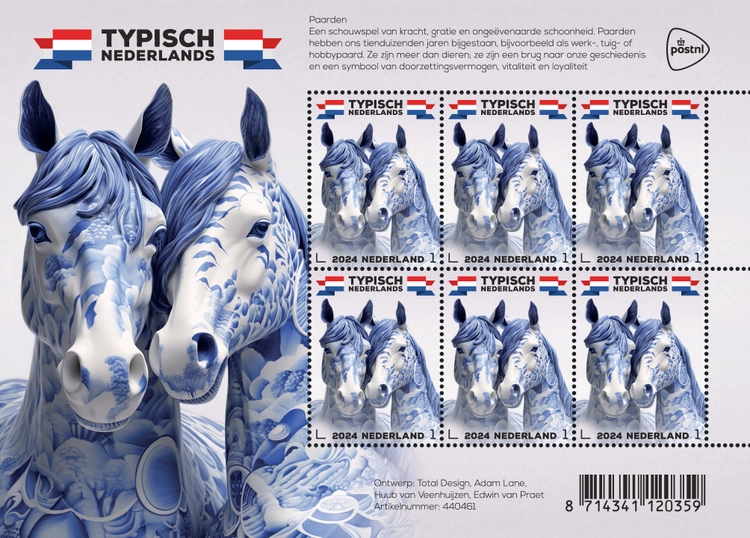 De vandaag uitgegeven postzegels ‘Typisch Nederlands - paarden’ zijn ontworpen door het bureau Total Design uit Amsterdam. Op de zegels zijn 2 paarden vol kracht, gratie en liefde geportretteerd. Ze staan dicht tegen elkaar aan, terwijl hun hoofden elkaar raken. De ontwerpers van het bureau gaven een moderne twist aan de postzegels door met behulp van het AI-programma Midjourney portretten te ontwerpen als beeldjes van glanzend Delfts blauw.