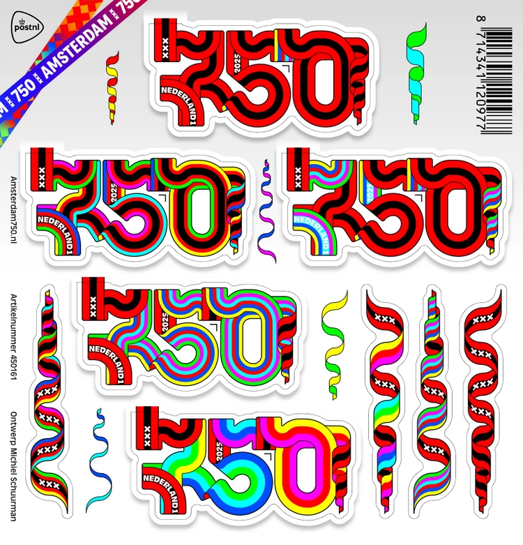 De postzegels tonen het getal 750 in de vorm van een doorlopend lint, een speelse verwijzing naar de officiële jubileumslinger van de stad. Elk ontwerp heeft een eigen kleurstelling, geïnspireerd door de diversiteit en levendigheid van Amsterdam. De typische Amsterdamse andreaskruisen en serpentines voegen extra herkenbaarheid toe. “Met dit bijzondere postzegelvel eren we niet alleen het verleden, maar vieren we ook de toekomst van Amsterdam,” aldus Maurice Unck, directeur Mail Nederland van PostNL. “Als hoofdstad heeft Amsterdam een unieke plek in ons land en in de harten van velen. PostNL is trots om met dit ontwerp bij te dragen aan deze feestelijke mijlpaal.”