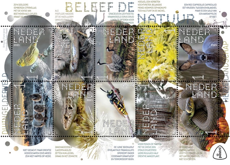 In de serie Beleef de natuur geeft PostNL dit jaar 4 postzegelvellen uit met in totaal 40 postzegels. Op de postzegels komen afbeeldingen voor van planten en dieren in bijzondere Nederlandse natuurgebieden. Later dit jaar verschijnen nog postzegelvellen over het moeraslandschap De Onlanden (22 februari), het duingebied Duin en Kruidberg (14 juni) en het park bij de landgoed Haarzuilens (16 augustus).