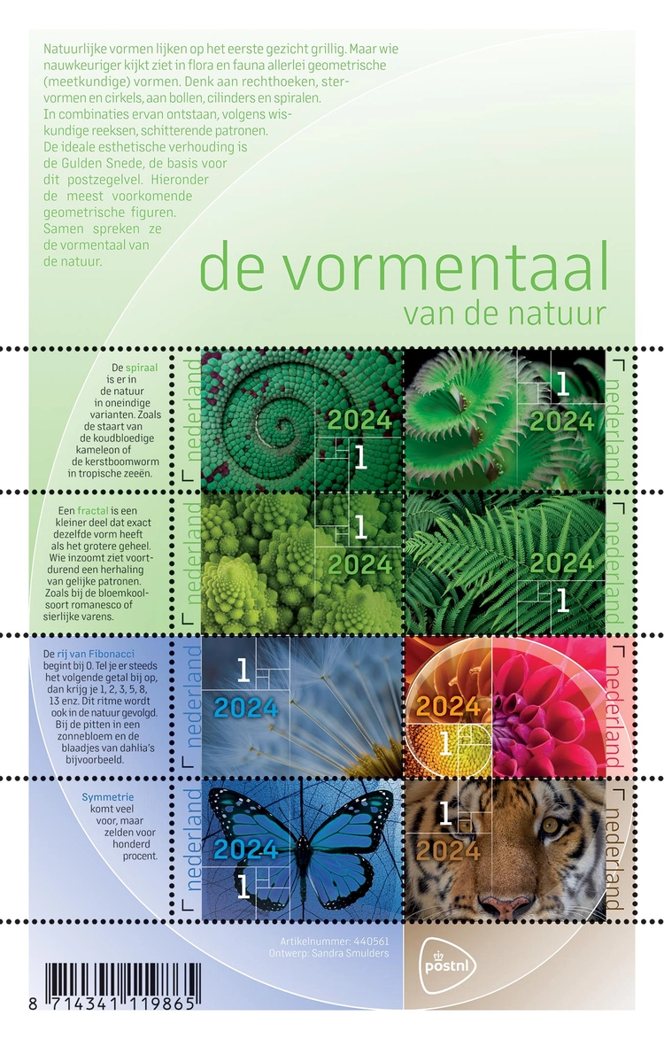 Het postzegelvel ‘De vormentaal van de natuur’ is ingedeeld op basis van de esthetisch ideale verhouding van de gulden snede, verbeeld door rechthoeken van verschillende grootte. Volgens de gulden snede verhoudt de grootste rechthoek zich tot de kleinste zoals beide rechthoeken samen zich verhouden tot de grootste rechthoek. De rechthoeken op de postzegels zijn met elkaar verbonden door een witte lijn in de vorm van een spiraal. Andere, minder bekende patronen zijn fractals en de rij van Fibonacci.