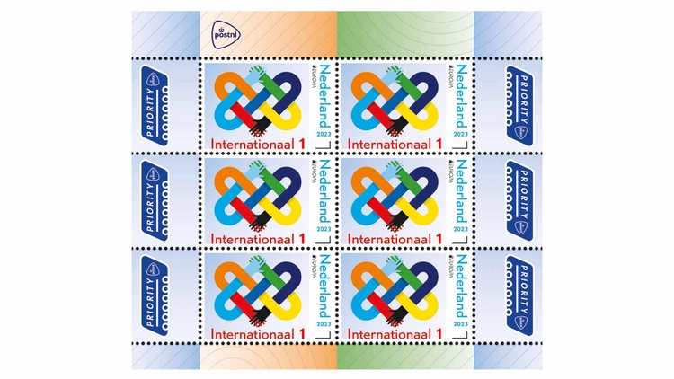 Den Haag, 9 mei 2023. Vandaag geeft PostNL een bijzonder postzegelvel uit, getiteld ‘Vrede, de hoogste waarde van de mensheid’. Op de 6 gelijke postzegels staat een ontwerpmotief dat is opgebouwd uit kleurrijke, oneindige knopen in hartvormen waarbij de hoekpunten zijn vervangen door ineen gestrengelde handen. De postzegels zijn uitsluitend bestemd voor internationale post.