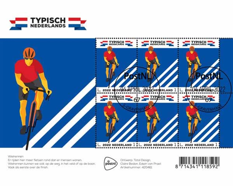 Het postzegelvel Typisch Nederlands - wielrennen telt 6 gelijke postzegels met de waardeaanduiding Nederland 1, bedoeld voor post tot en met 20 gram met een bestemming binnen Nederland. De postzegels zijn vanaf 4 april 2022 verkrijgbaar bij de Bruna-winkels en via www.postnl.nl/bijzondere-postzegels. De postzegels zijn ook telefonisch te bestellen bij de klantenservice van Collect Club op telefoonnummer 088 - 868 99 00. De geldigheidstermijn is onbepaald.