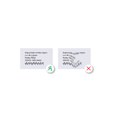 Let op: de inkt mag niet vlekken en de print moet minimaal 300 dpi zijn, zowel voor je frankering, adressering en codering.